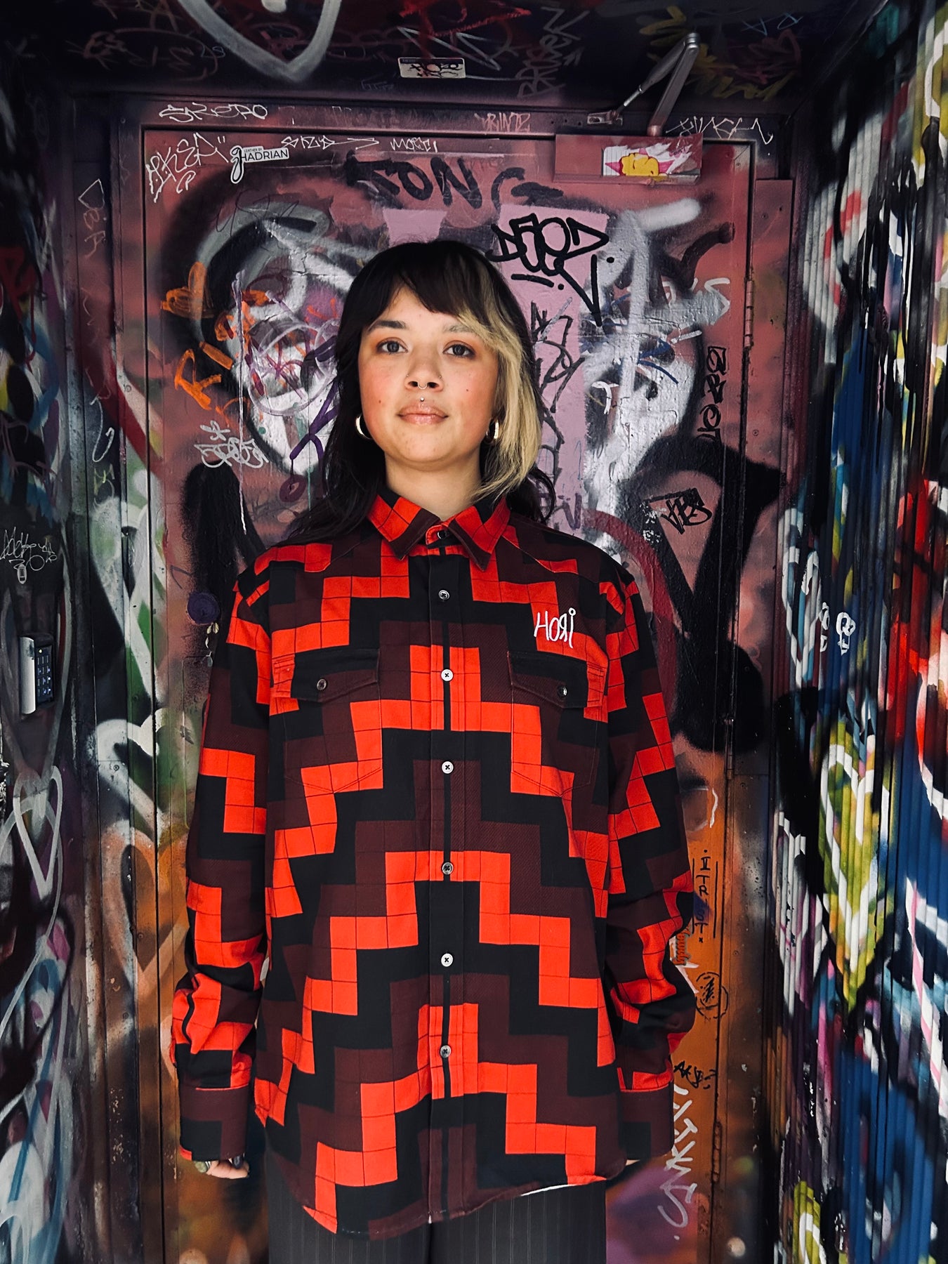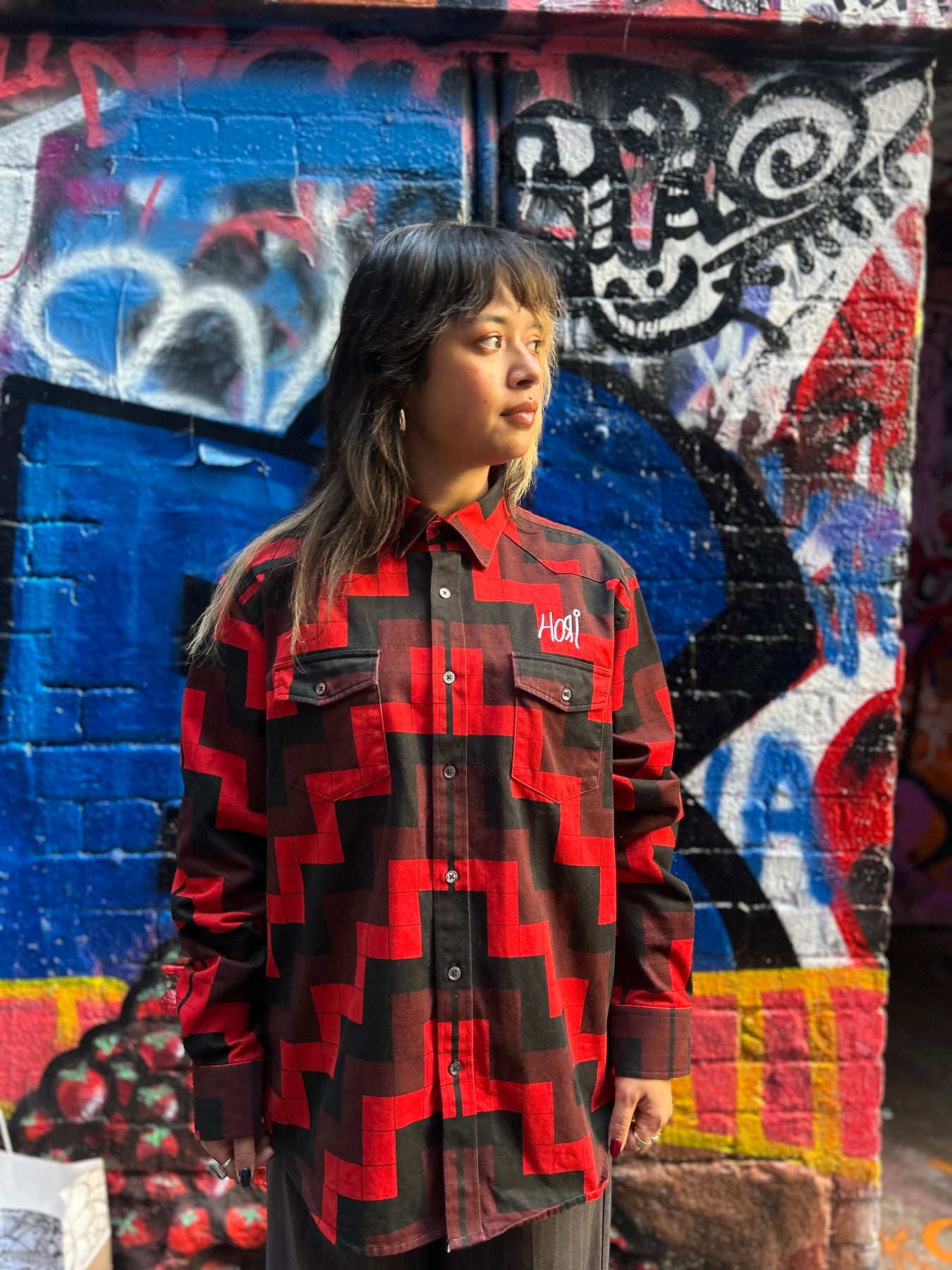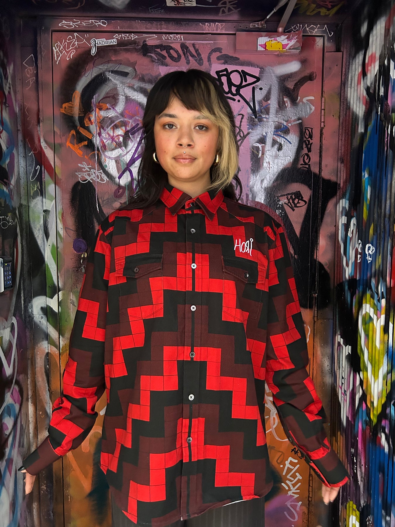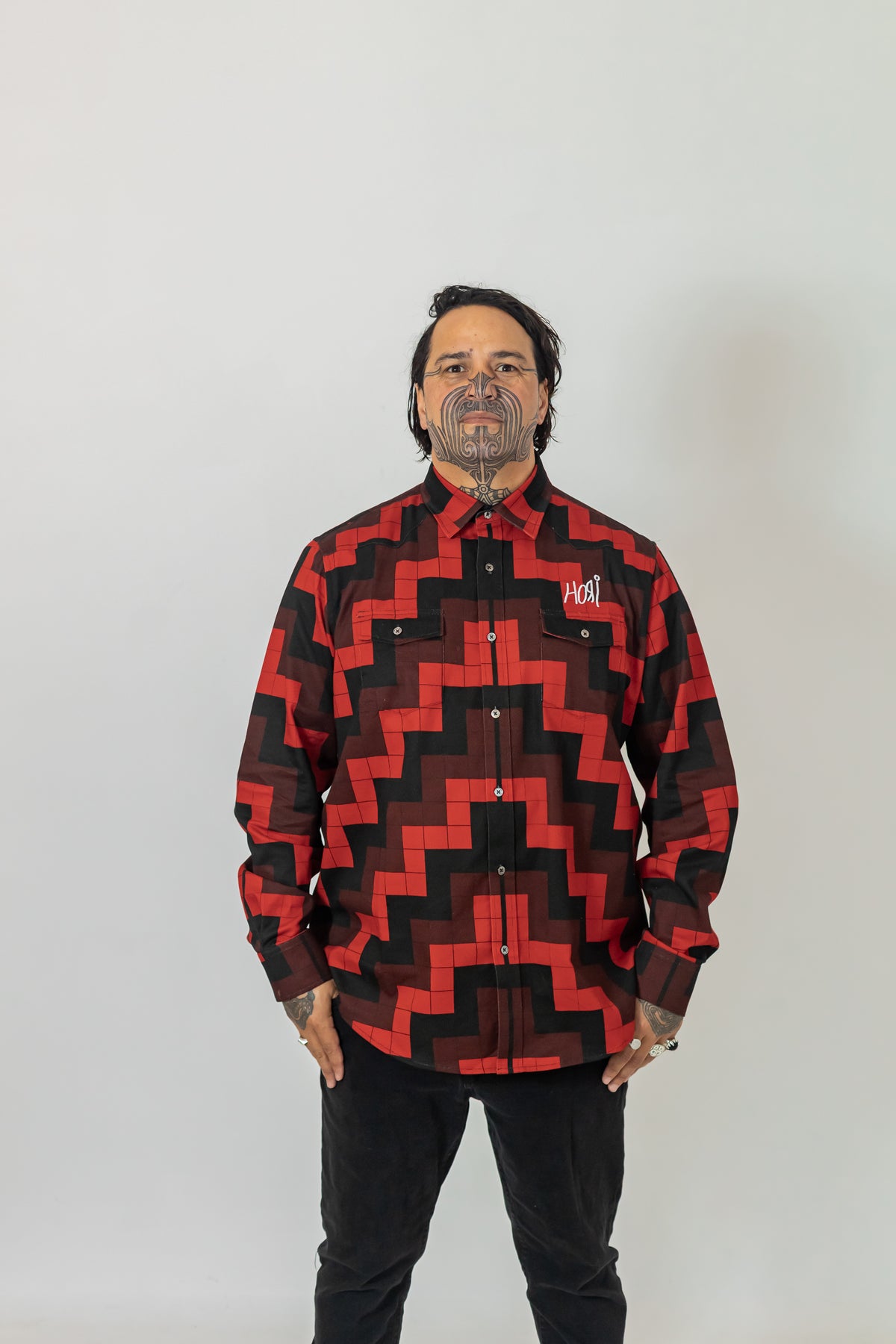 Poutama Churt - Our red check churt has always been a staple in the hori arsenal - so after about 7 years we decided to revamp shirt and add a bit of Māori flair by creating a Poutama design using the classic check. ( this wasnt easy but we are stoked how its come out )