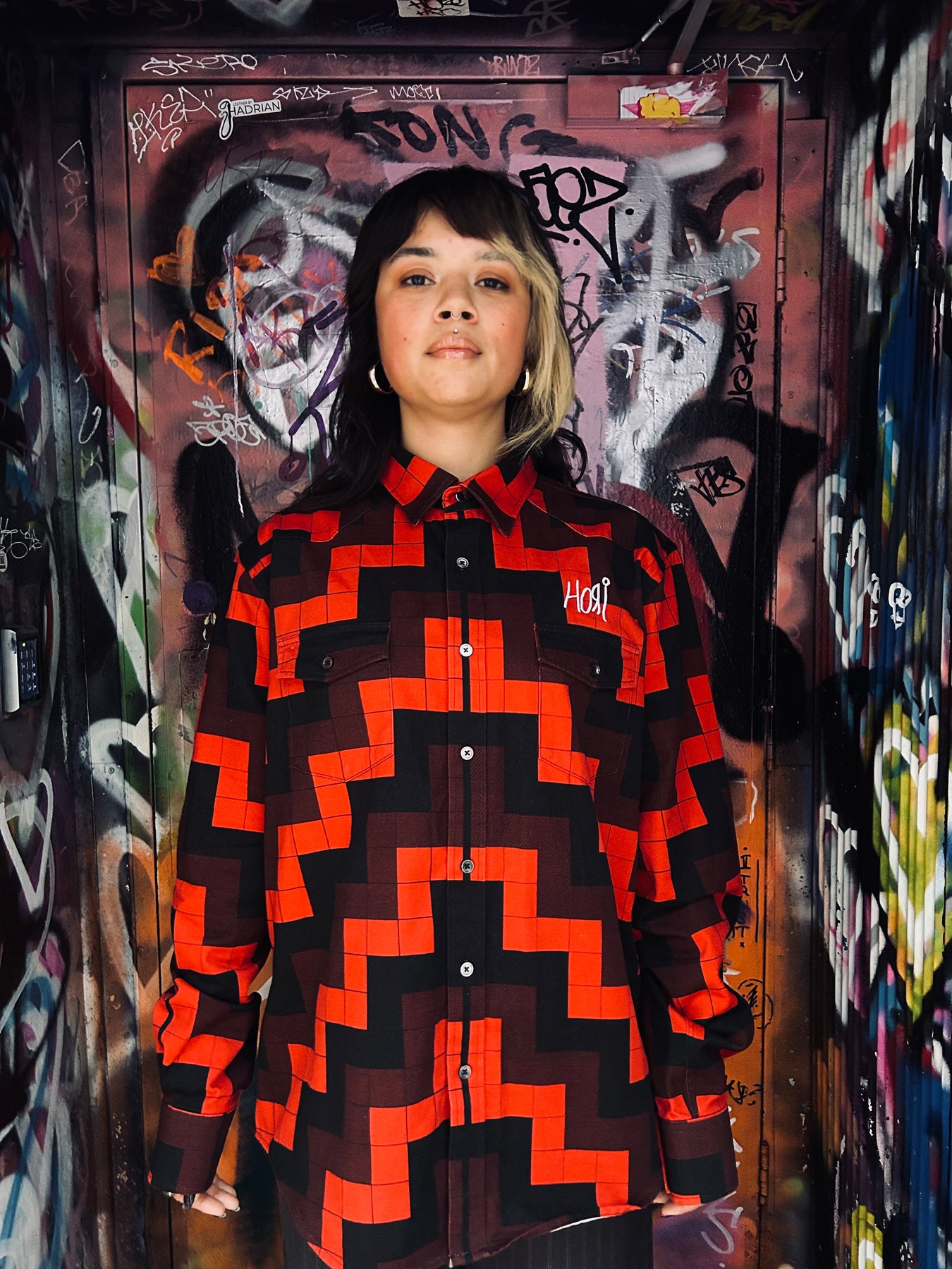 The Poutama design represents progression and growth — a pattern steeped in Māori culture that carries real meaning. Tidy enough for those moments when you want to look sharp, relaxed enough to feel like yourself. It's a churt that works for gatherings, events, or whenever you need to feel grounded and intentional without trying too hard.